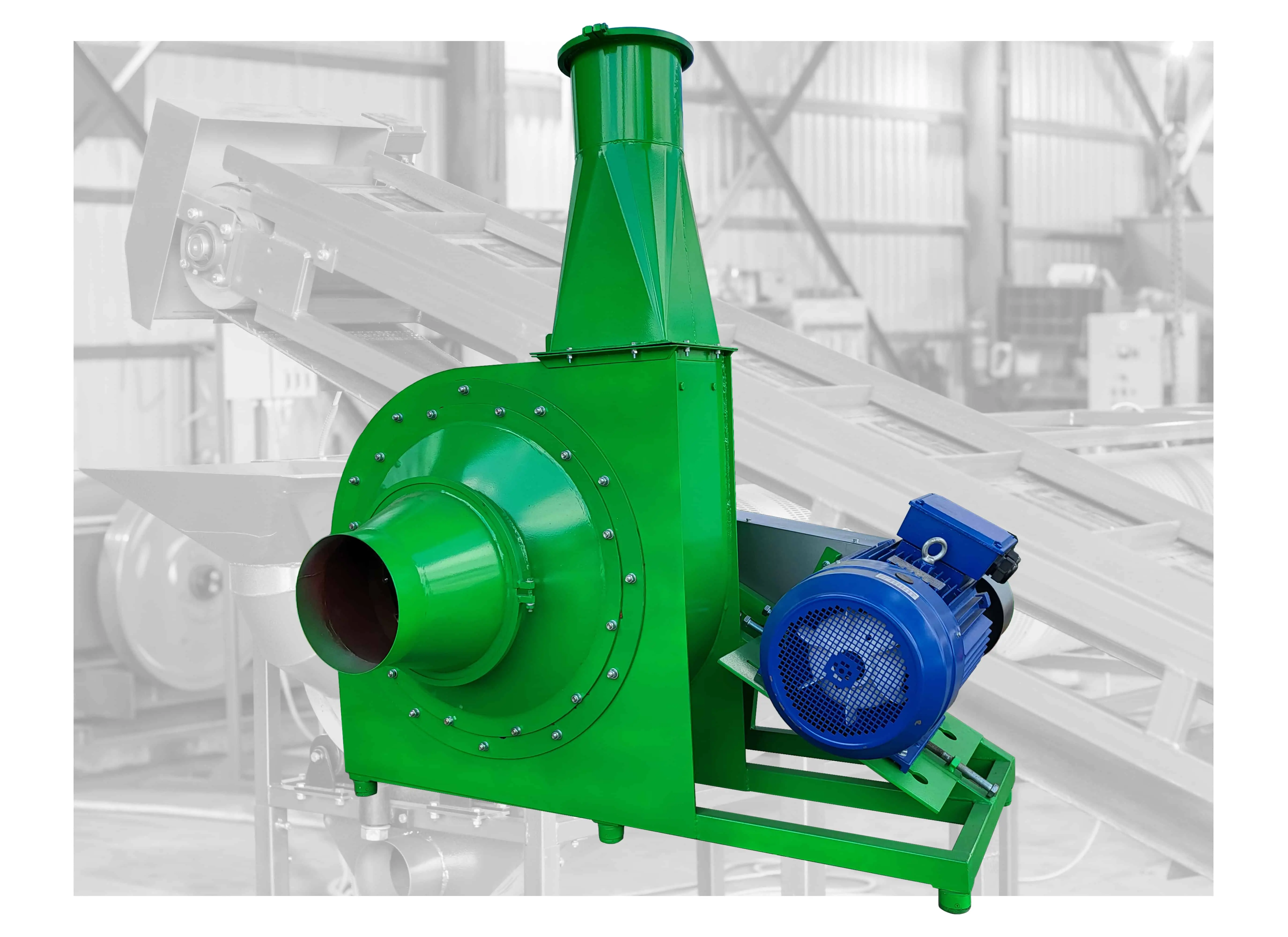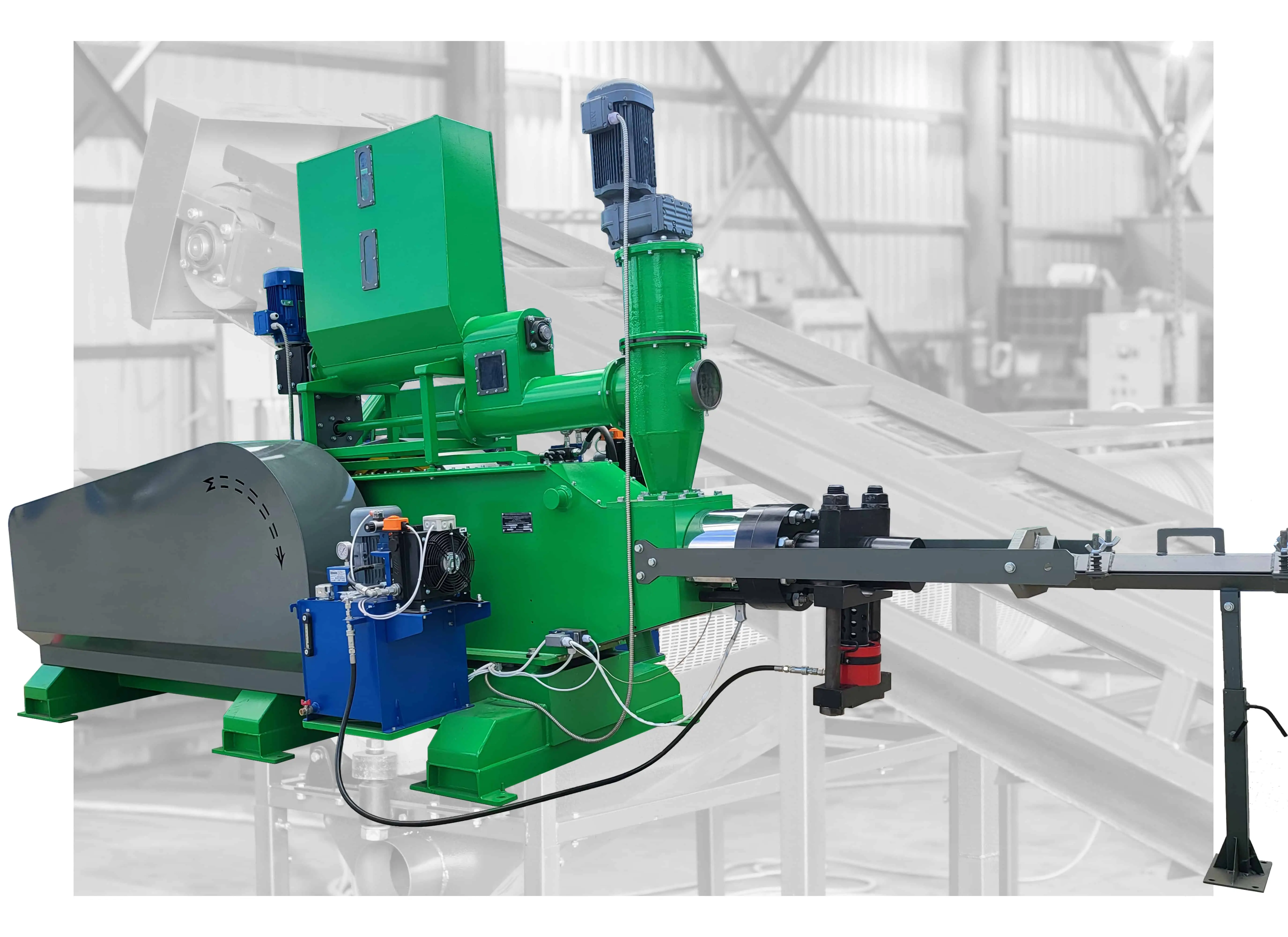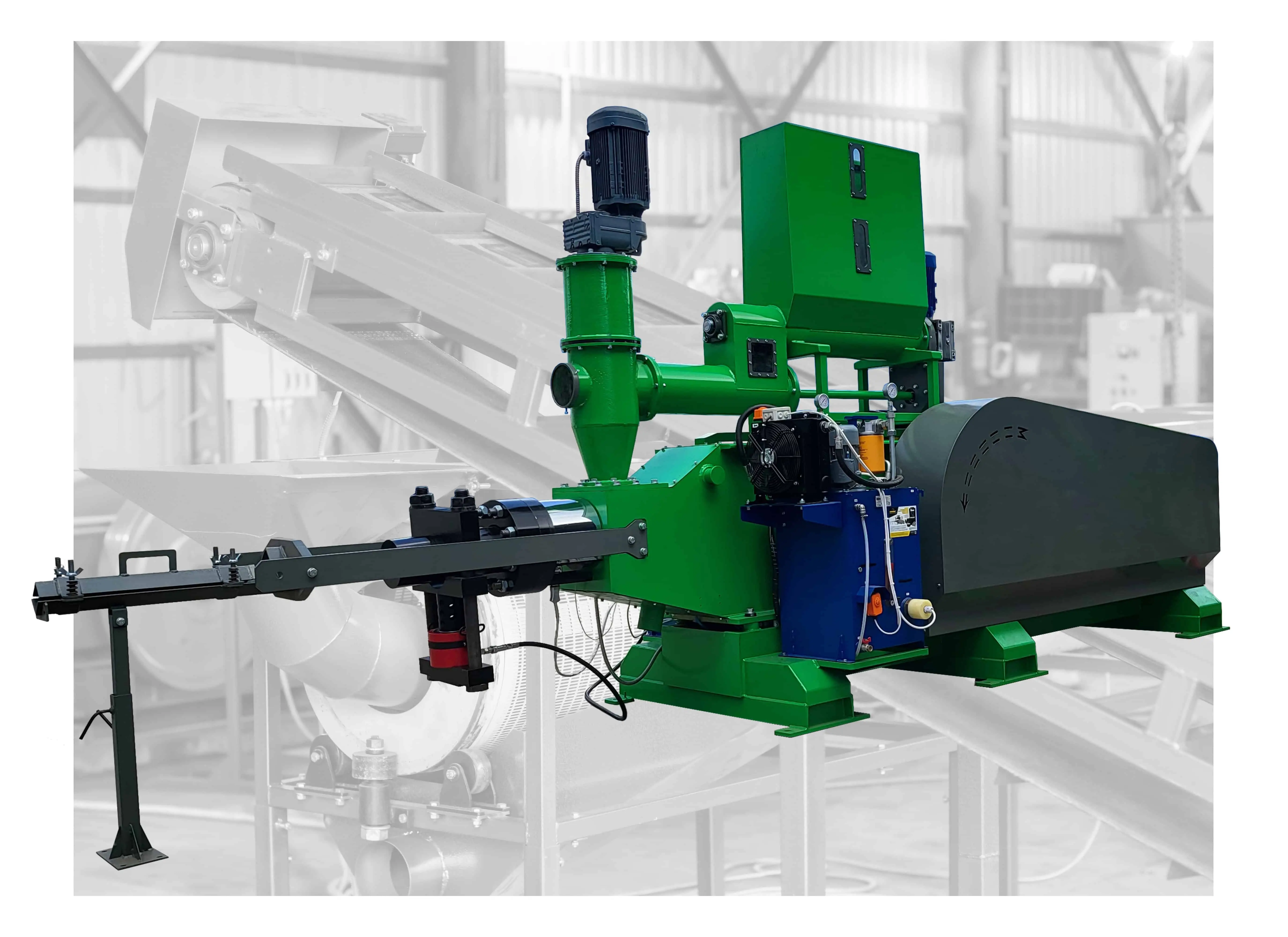 Kladivový drtič umožňuje drcení slámy po lámači balíků na zlomek 1-5 mm. Konečná frakce suroviny závisí na sítu. Tato jednotka funguje jako průchozí ventilátor.